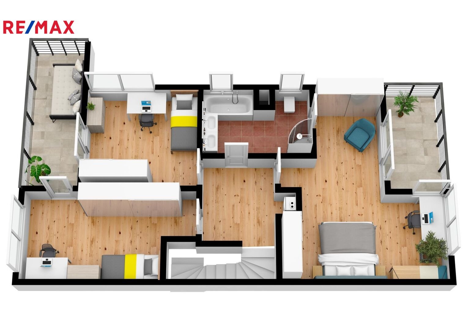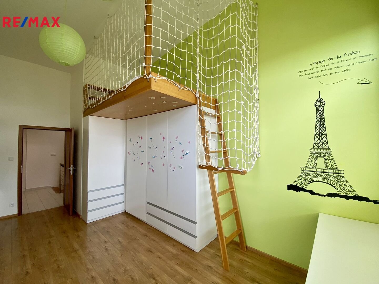 i obou dětských pokojů v patře, kde je také koupelna s vanou, sprchovým