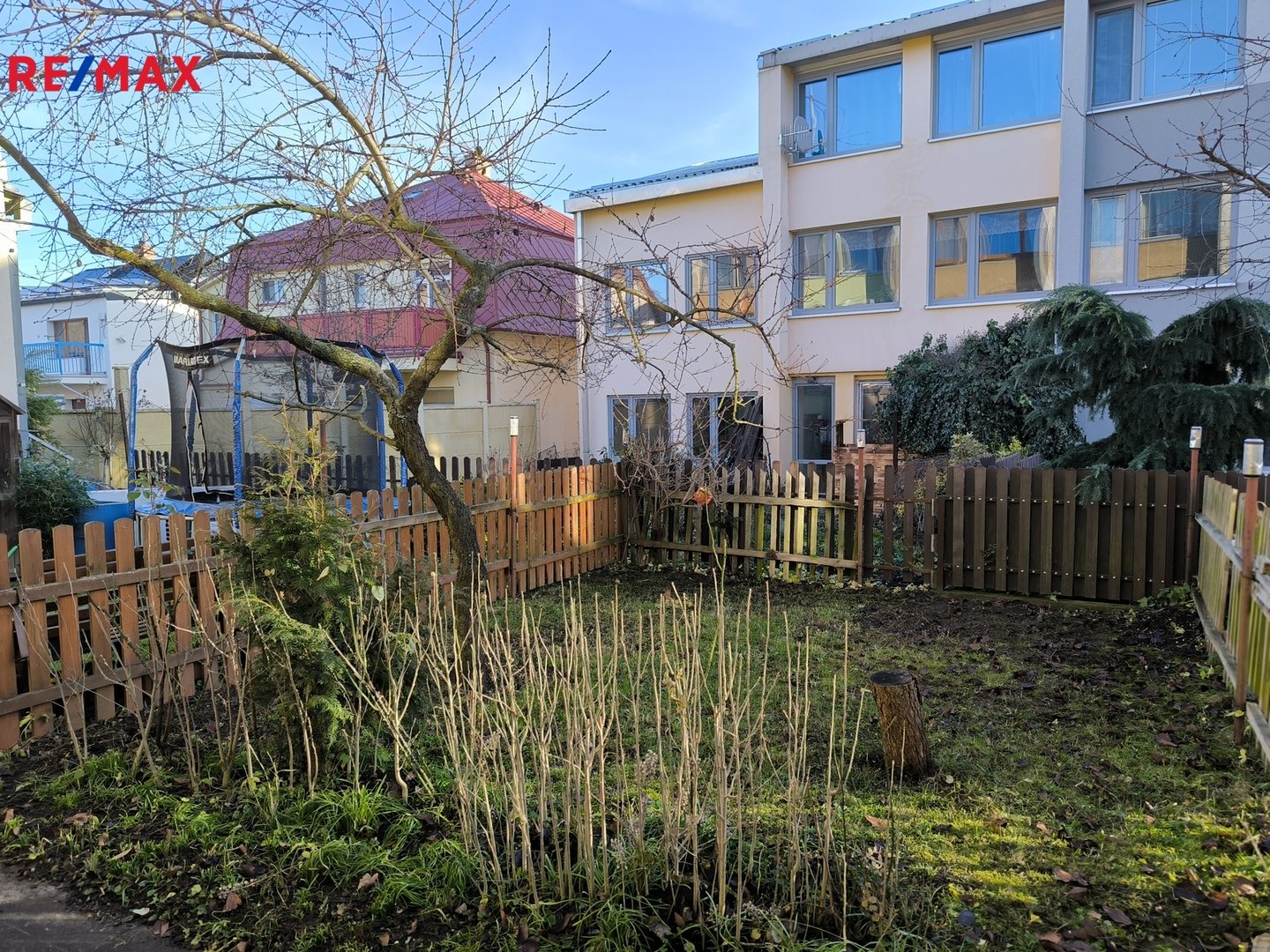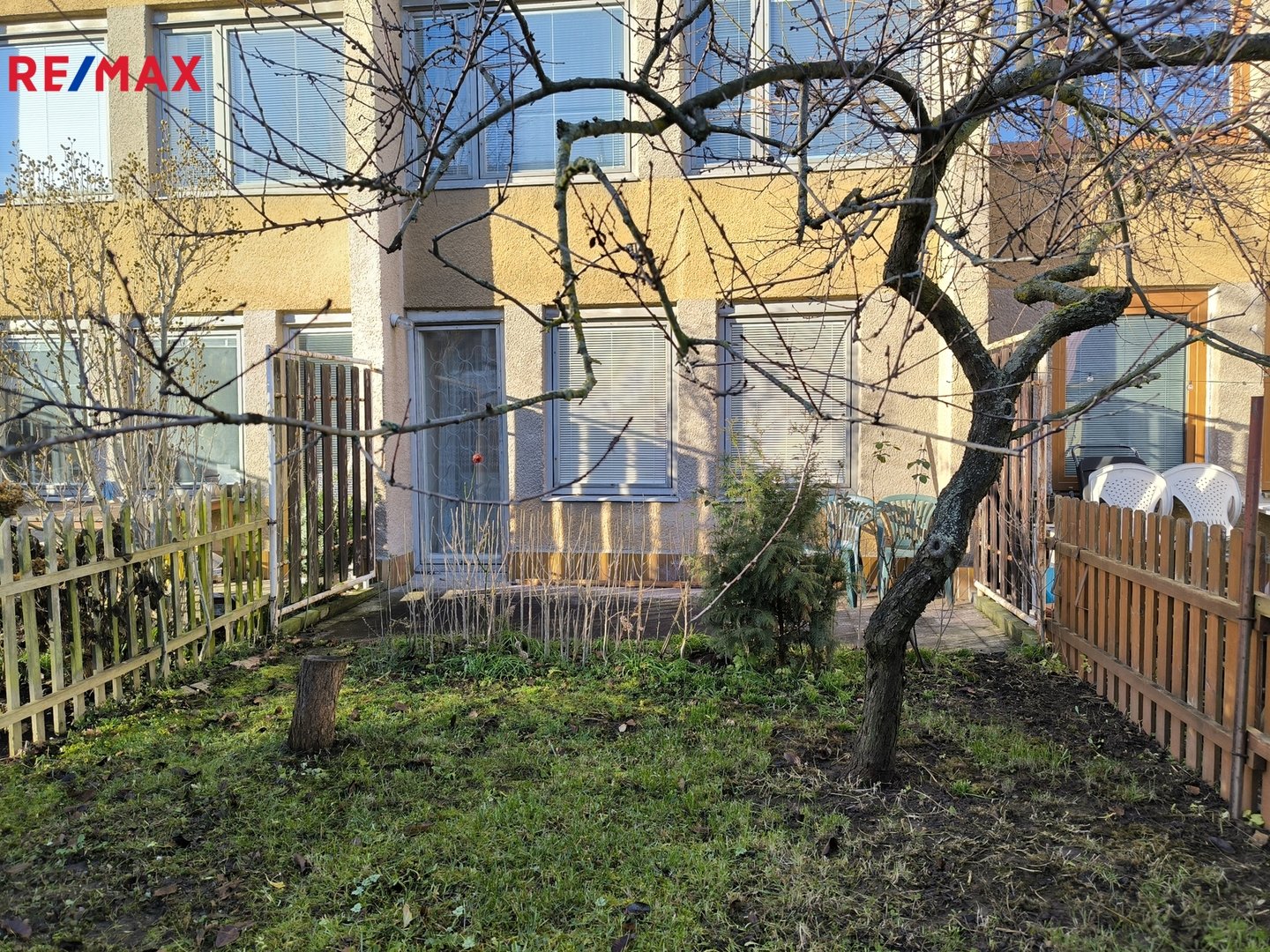 vstupem na zadní zahradu o velikosti 32 m²; přední část pozemku má