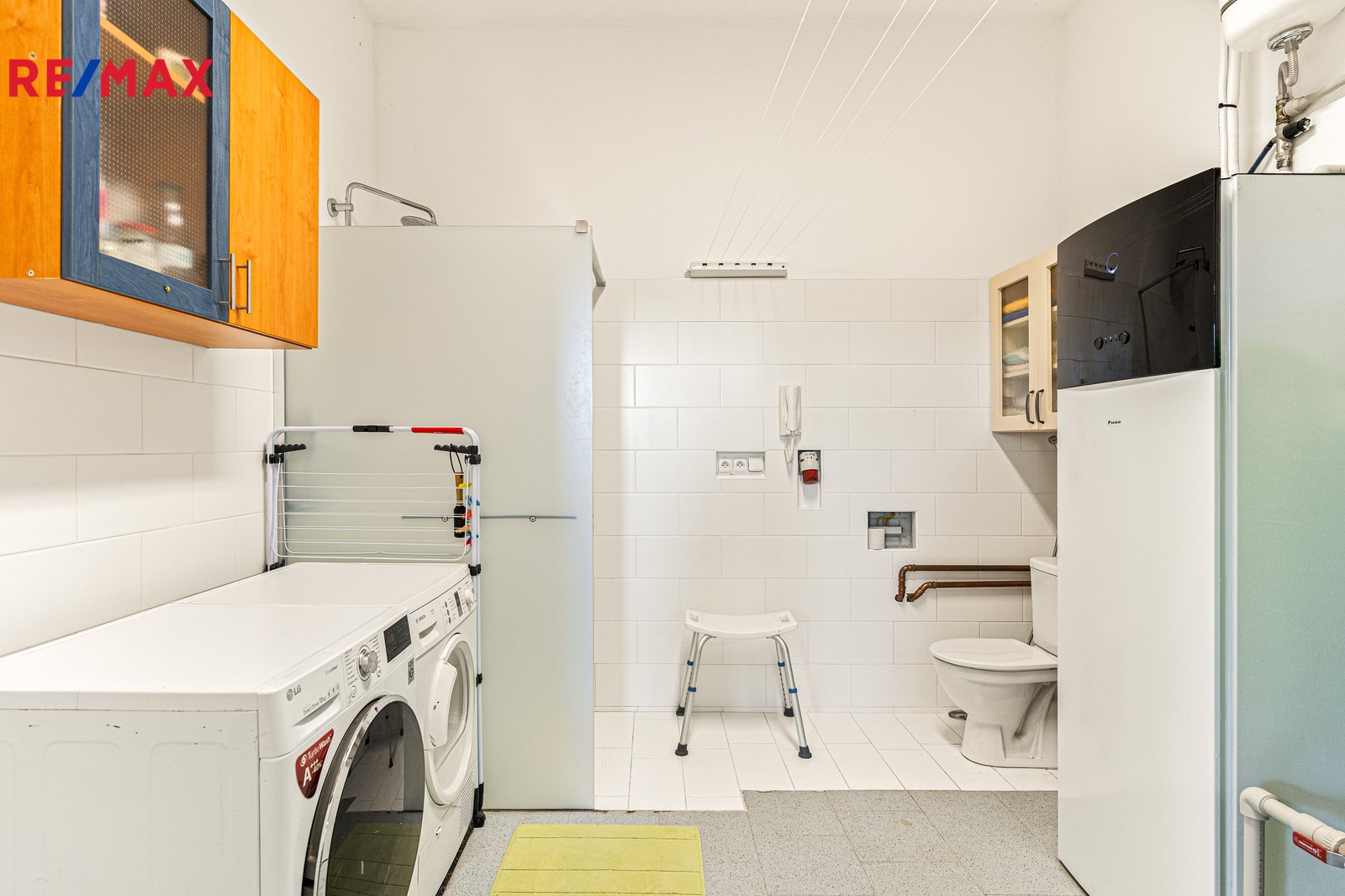 sprchovým koutem a WC, kde je umístěna pračka a sušička.