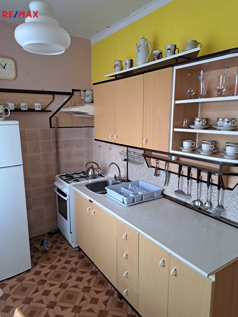 skříně. K bytu náleží sklep. Dálkové dodávky tepla a teplé vody.