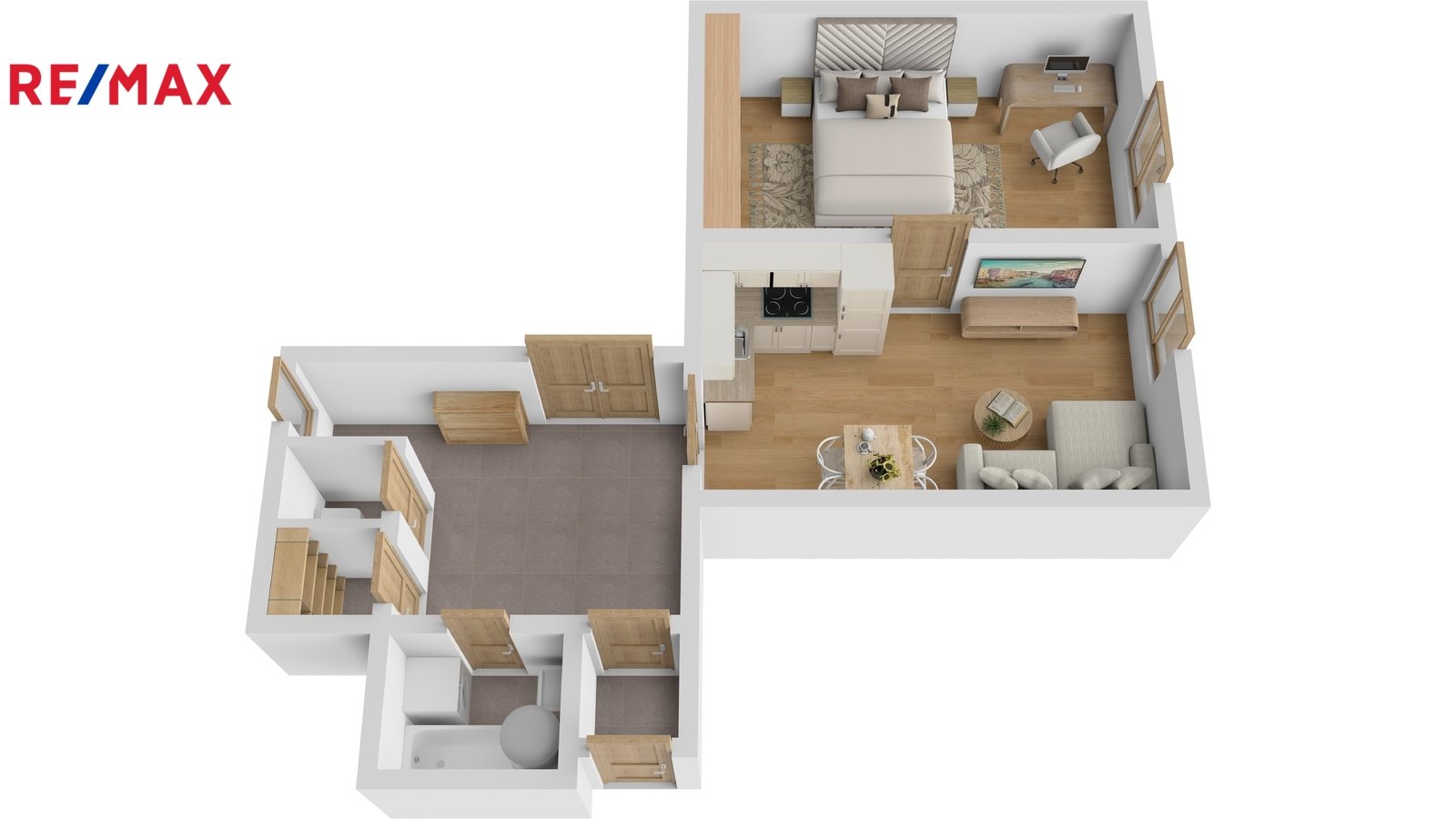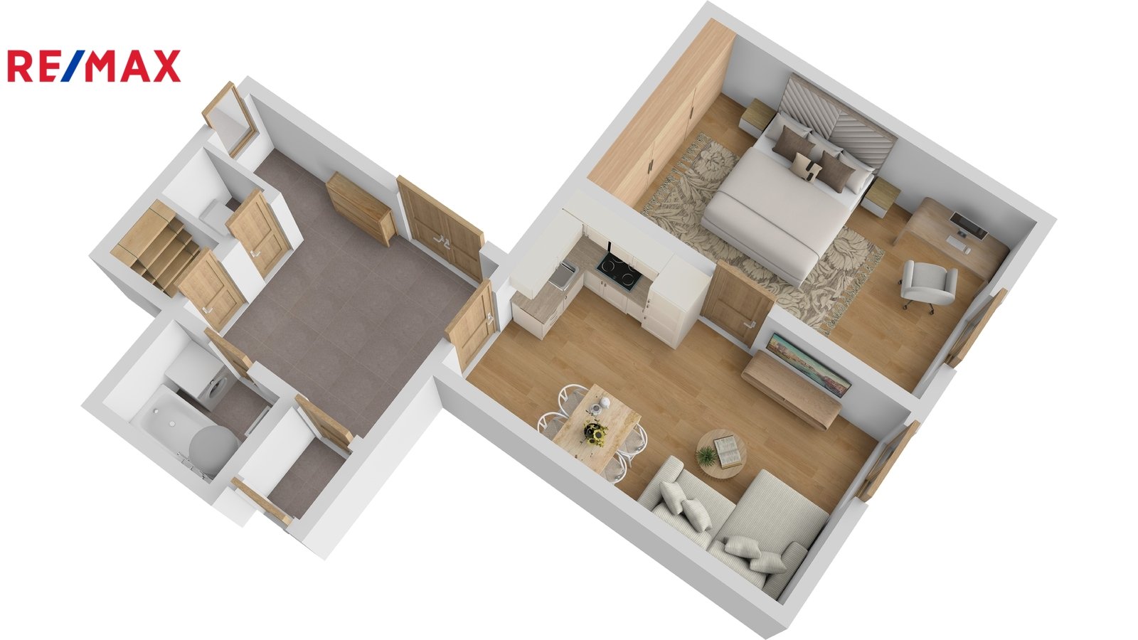 místnosti s kuchyňským koutem a dále vejdete do pokoje. Z chodby je dále