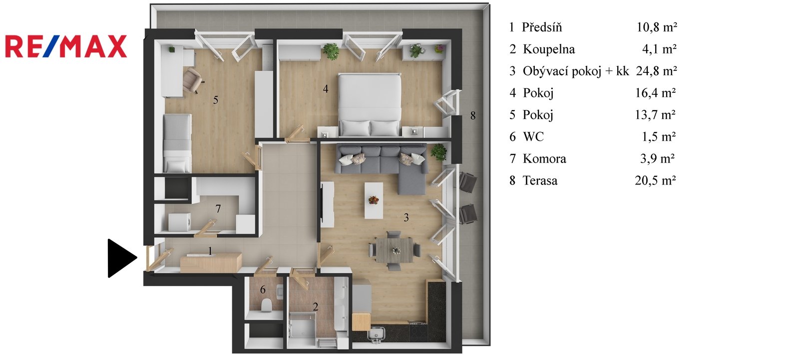 o dispozici 3+kk o celkové ploše 81 m² s terasou o velikosti 20 m²,