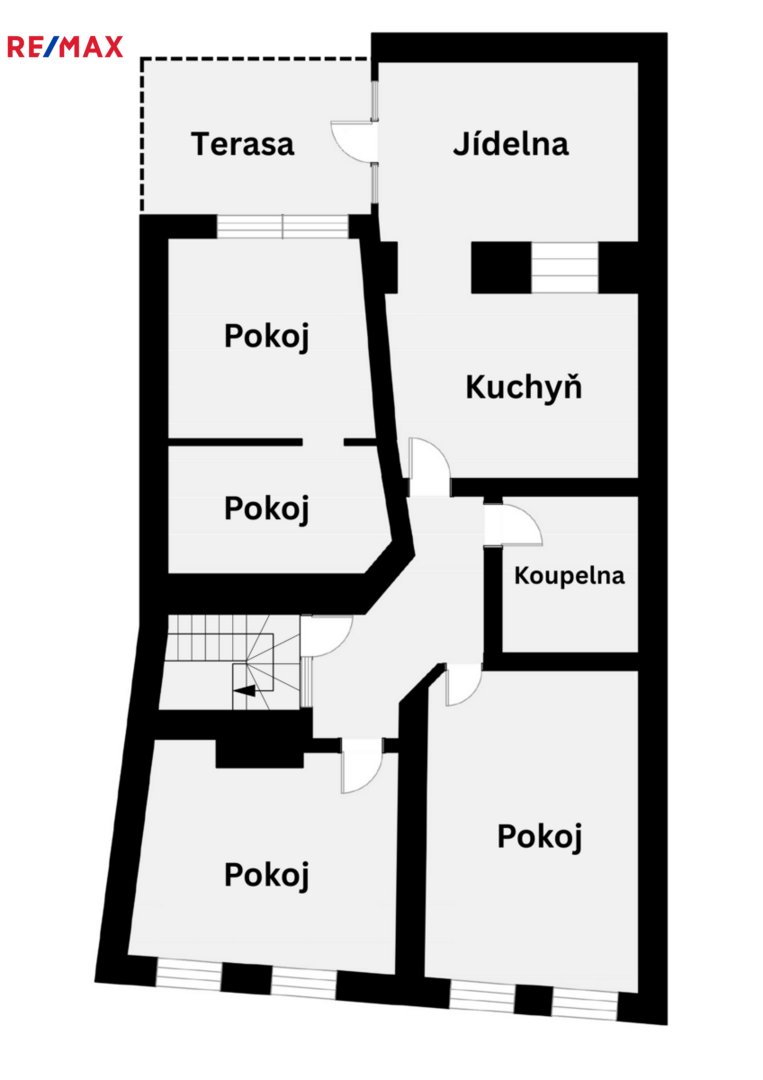 4 pokoje, kuchyň, jídelna, koupelna s toaletou a terasa. Díky vnitřnímu