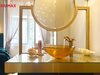 Pokoj s volně stojící vanou, která tvoří intimní relaxační zónu v dialogu s dominantní malbou a toaletním stolkem s umyvadlem.