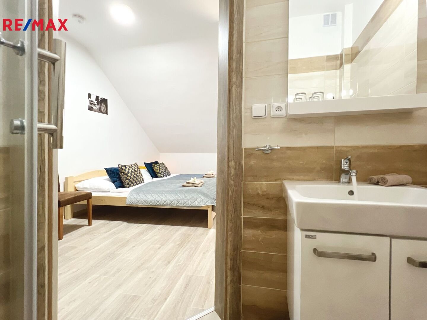 V patře se dále nachází samostatný apartmán o dvou pokojích opět s vlastní koupelnou se sprchovým koutem a odděleným WC. Prostor galerie je momentálně využitý jako dětský pokoj. Pro nové využití se nabízí jako společenská místnost, relax zona, nebo kinosál.