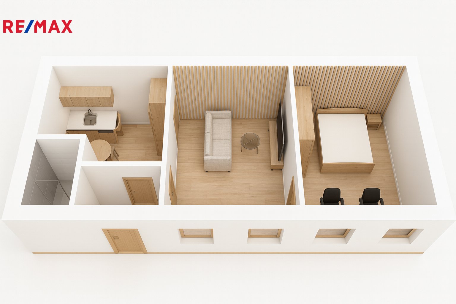 oddělený částečnou příčkou od ložnice, samostatnou kuchyni se