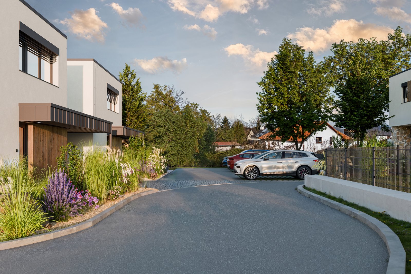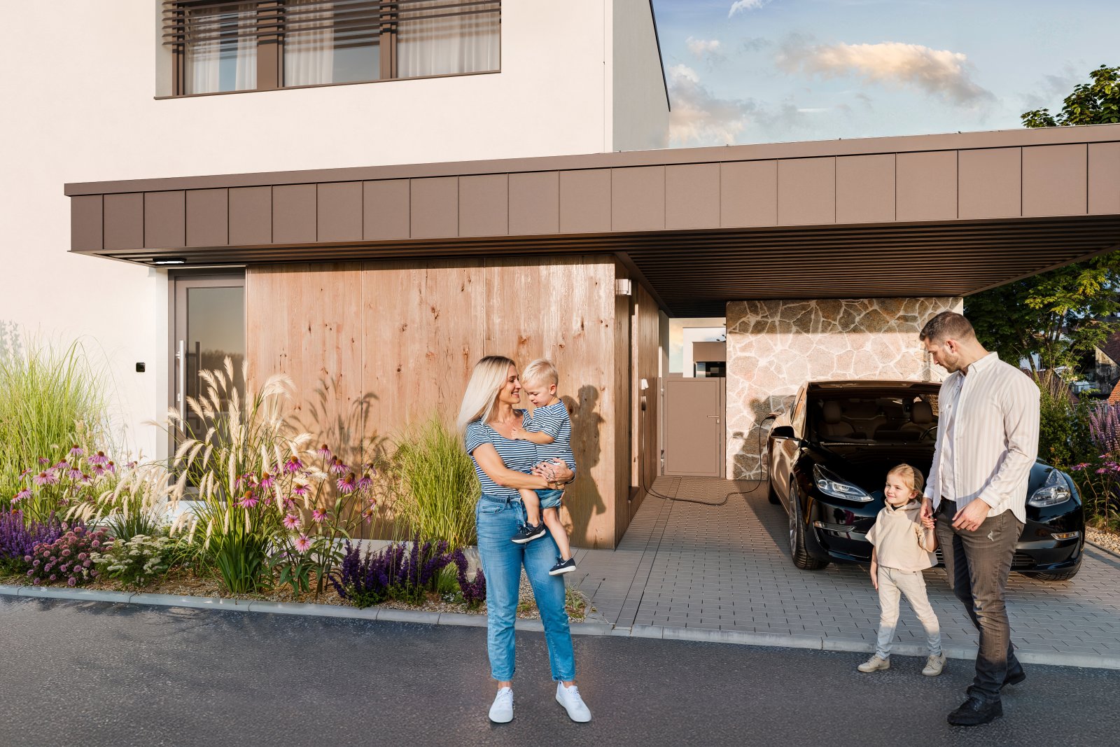 Součástí ceny je dokončený exteriér. Pozemek je oplocen svařovaným antracitovým plotem. Přední část pozemku je upravena zelení a doplněna o venkovní osvětlení se soumrakovým čidlem. Kryté parkovací stání je připraveno pro instalaci nabíjecího zařízení pro elektromobil.