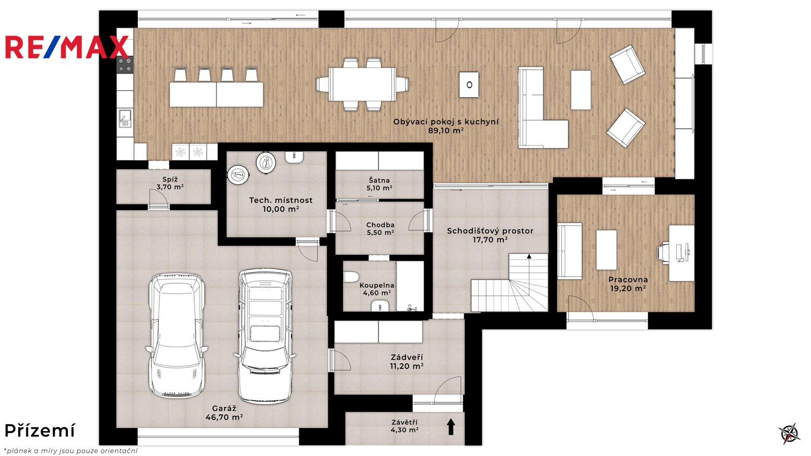 - obývací prostor s kuchyňským koutem (89 m²), s přímým vstupem