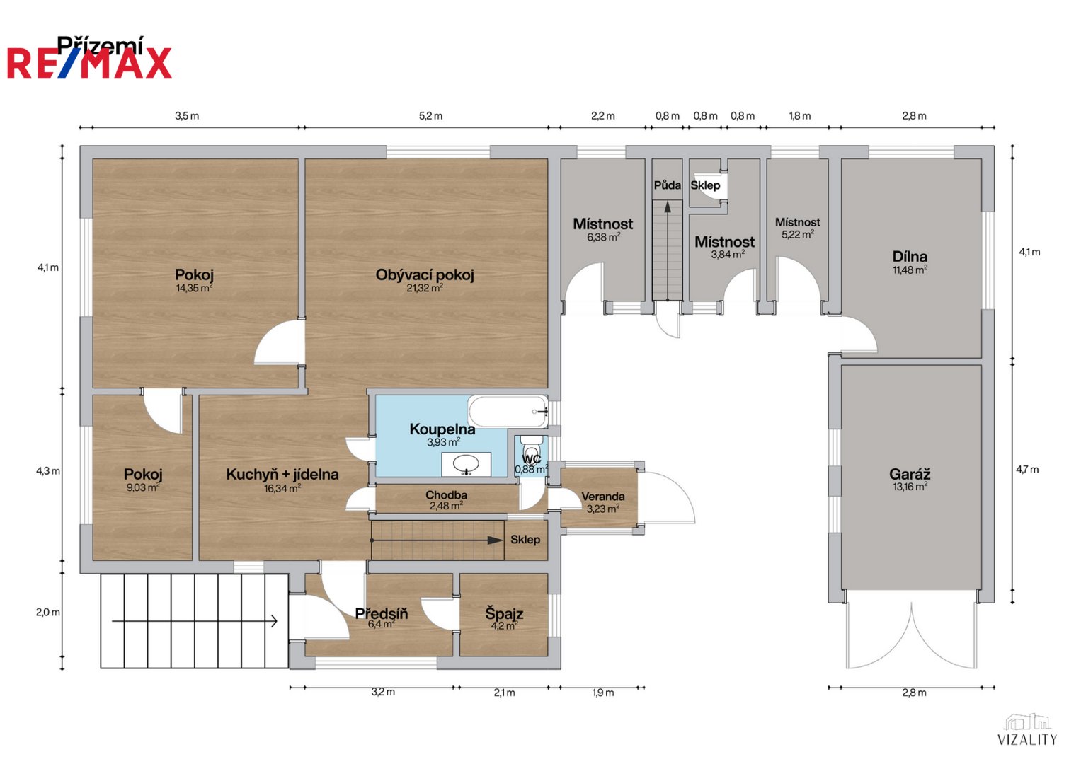 Celková zastavěná plocha činí 172 m². Nabízí tak dostatek prostoru pro
