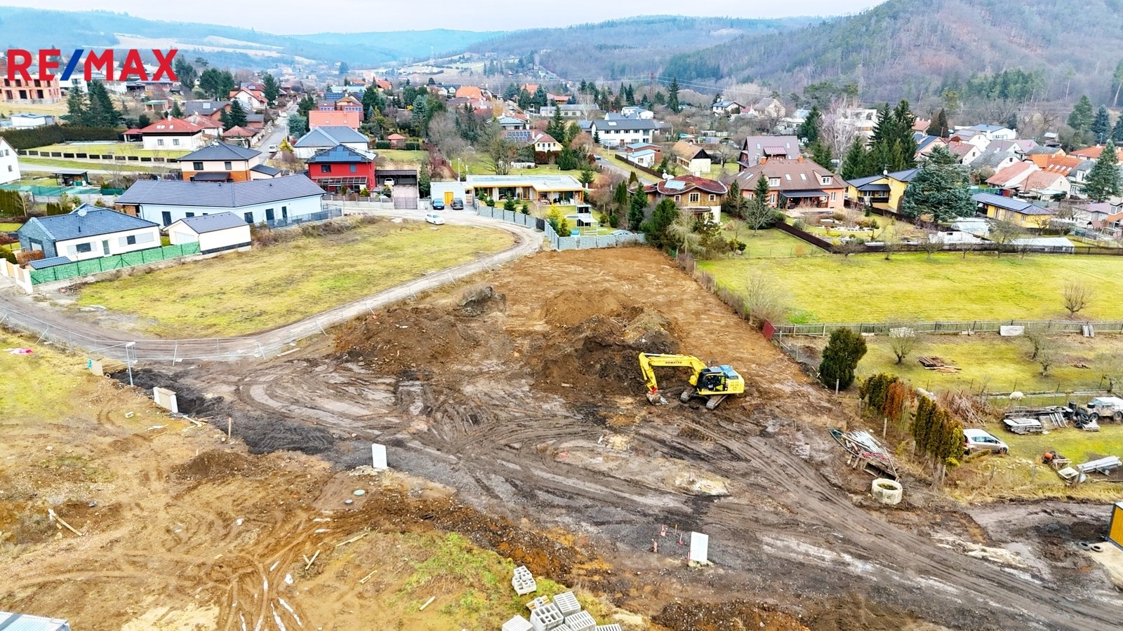 pokračující práce na příjezdových cestách, takže pozemek bude