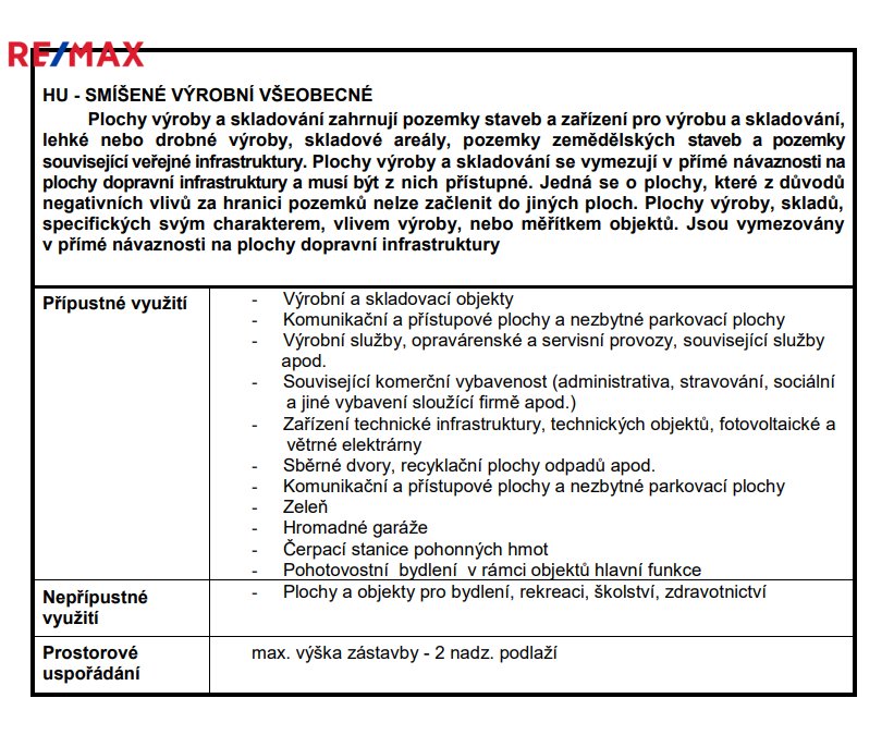 Přípustné využití ploch HU – Výrobní a skladovací objekty;