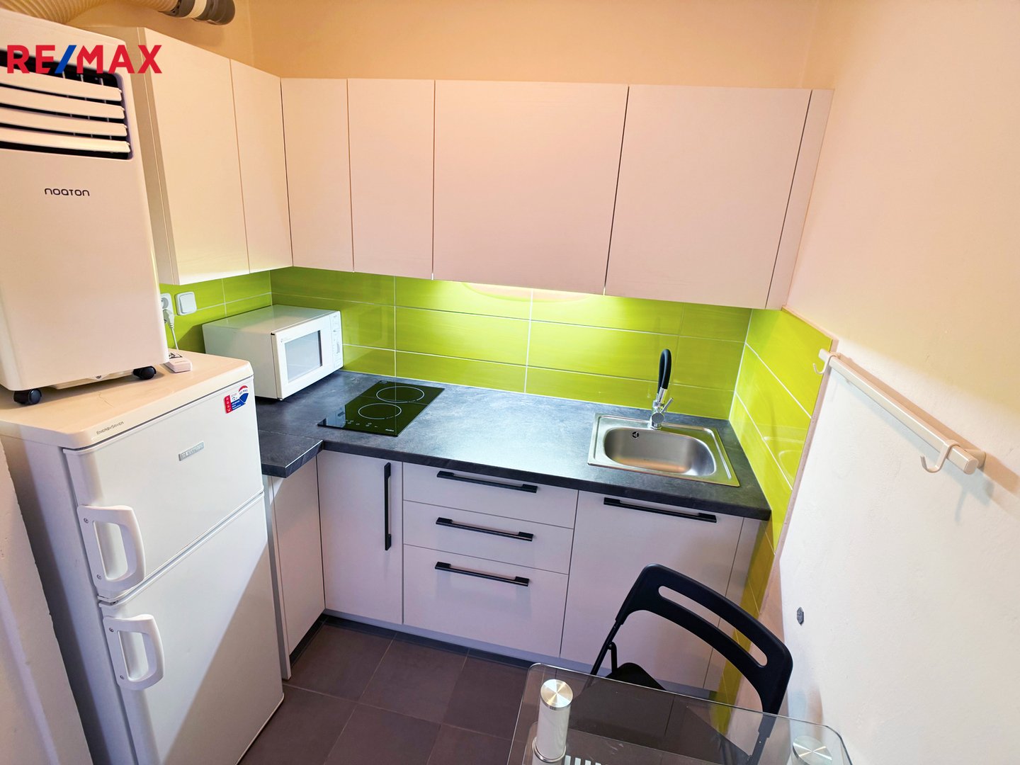 Byt je vybaven moderní kuchyňskou linkou vybavenou spotřebiči /lednice,