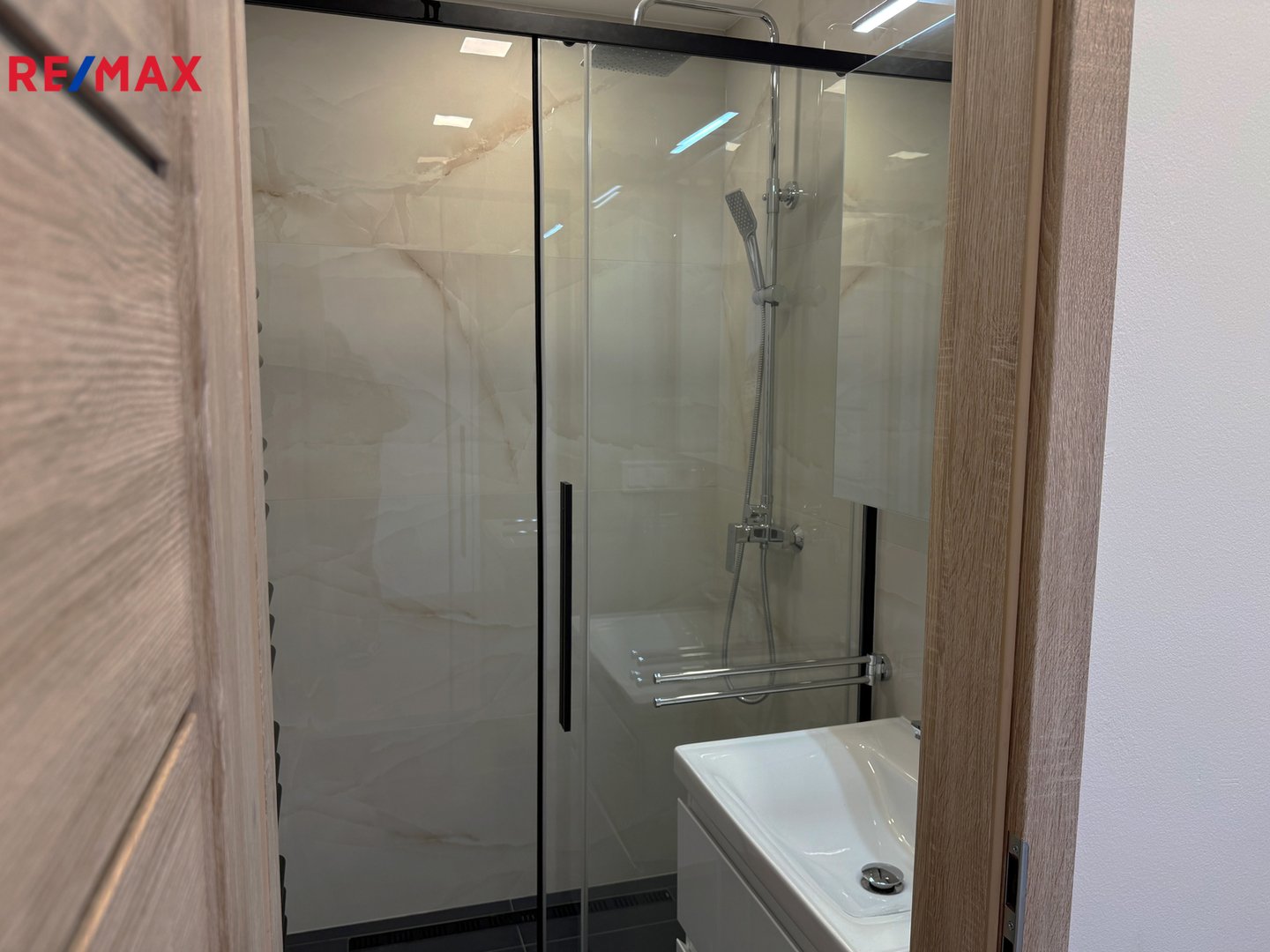 i pracovní stůl, moderní koupelna se sprchovým koutem a umyvadlem,