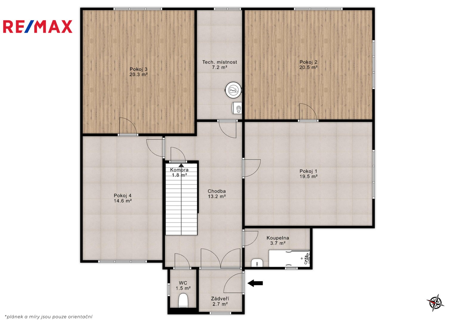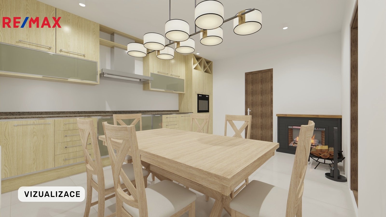 Aktuální dispozice 6+1 (4 místnosti v přízemí a 3 v patře) umožňuje