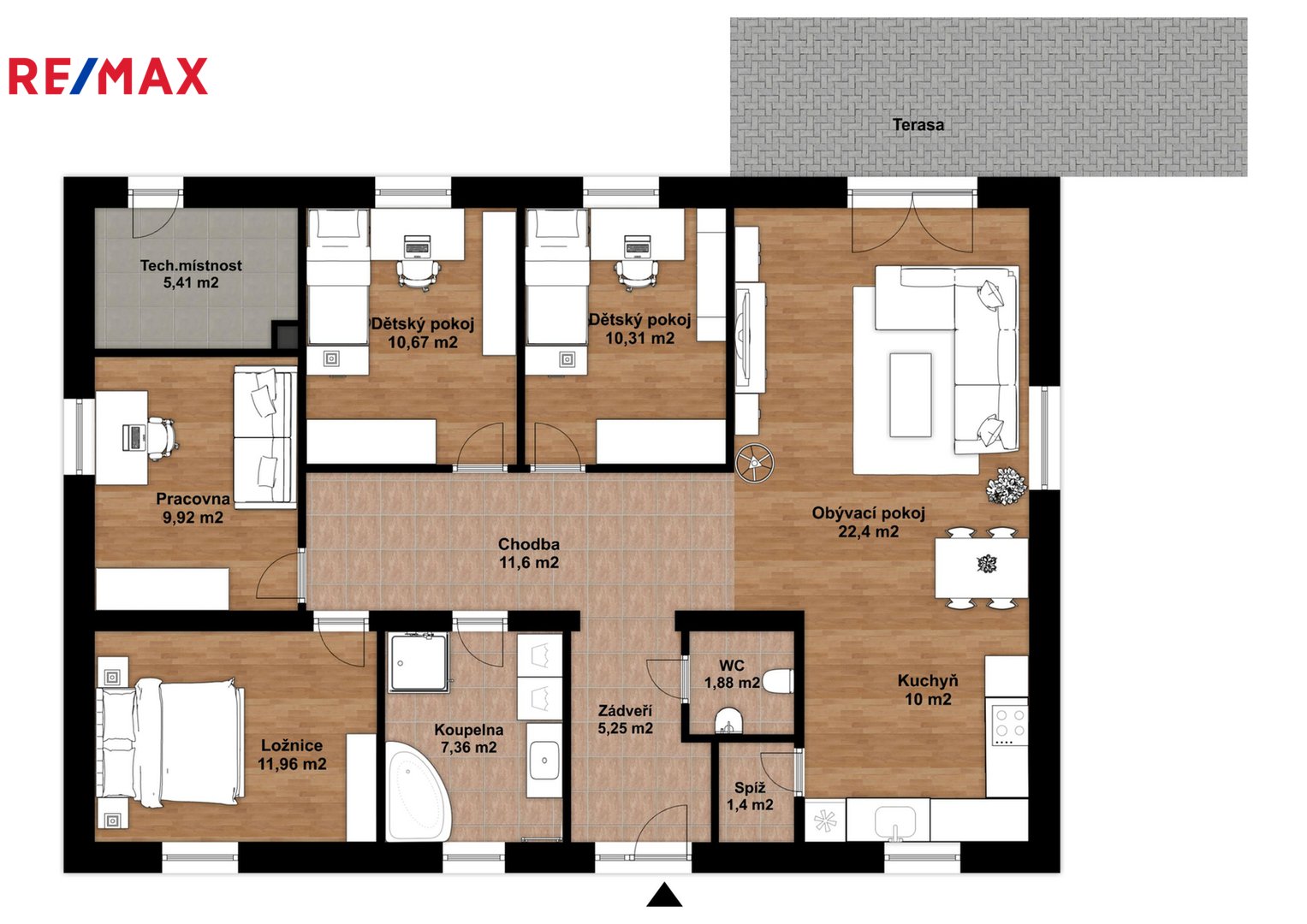 samostatné pokoje, koupelnu, samostatné WC, technickou místnost a spíž.