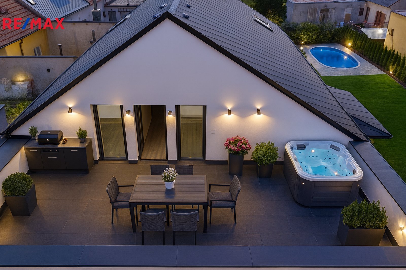 venkovní kuchyň, posezení nebo relaxační lehátka. Pro lehké sportovní