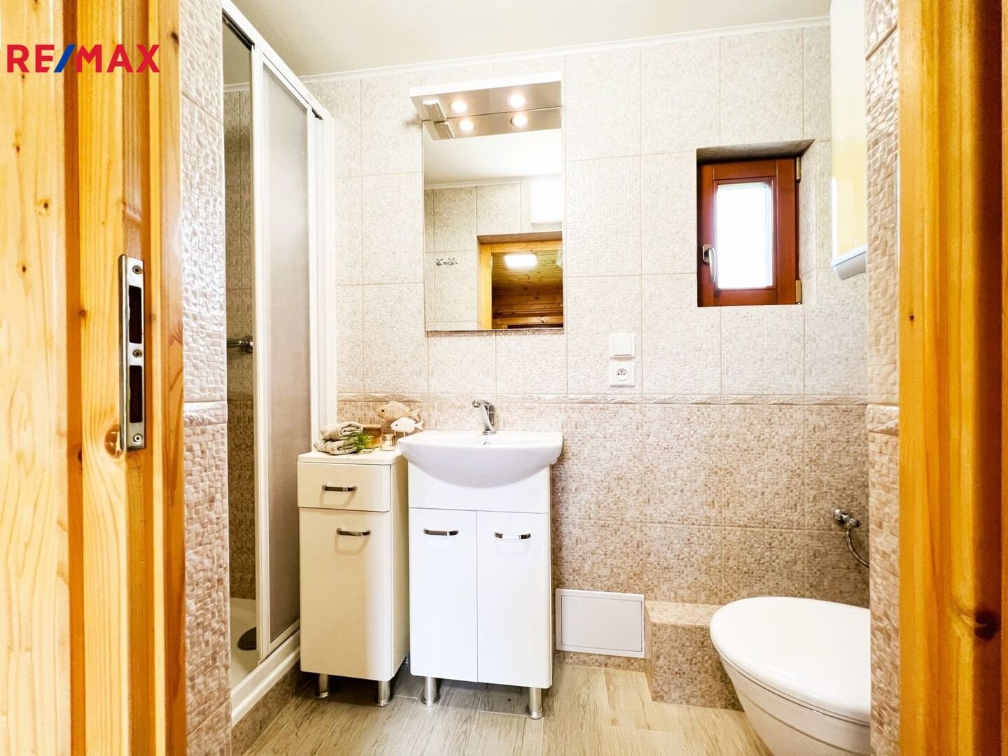 podlahy z kanadské borovice, nová koupelna se sprchovým koutem a WC, dále