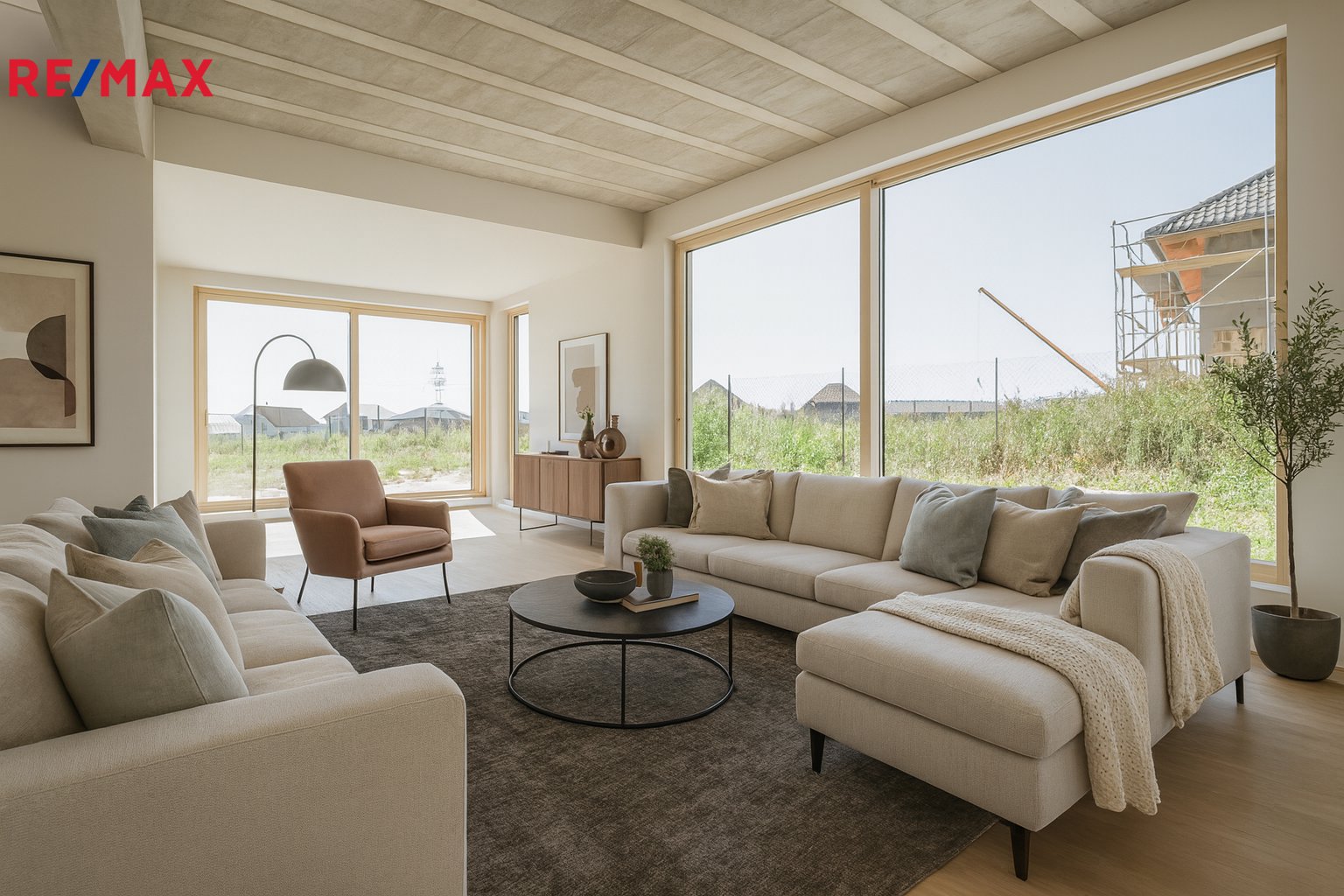 Hlavní jednotka: otevřený obytný prostor s výhledem do krajiny, kuchyň,