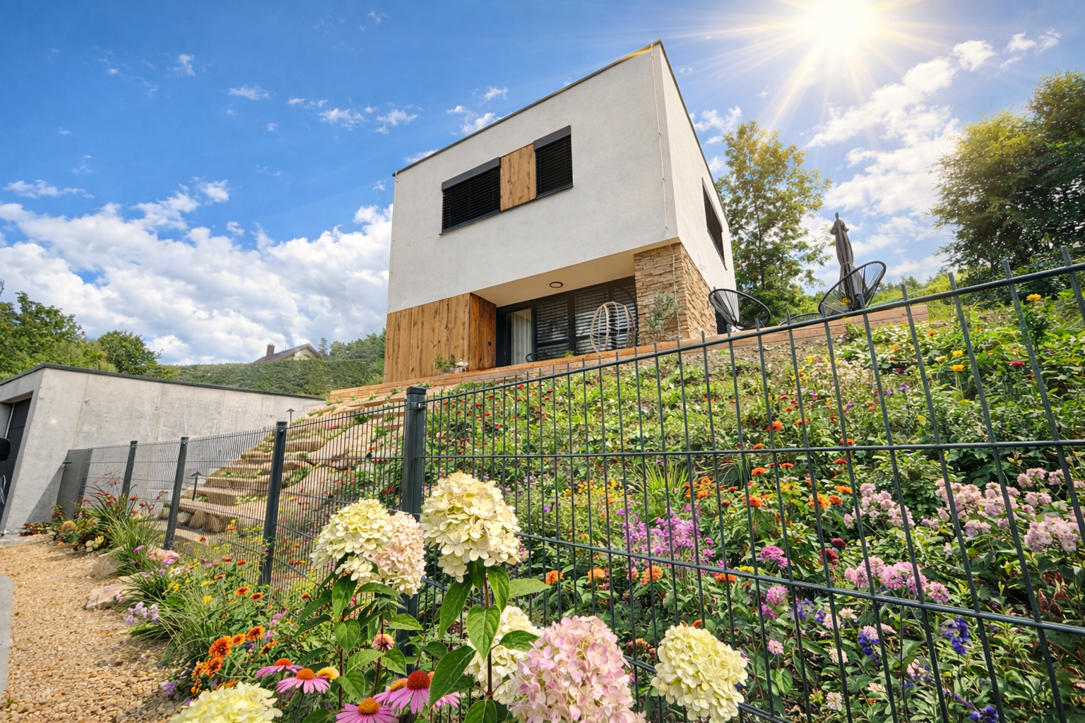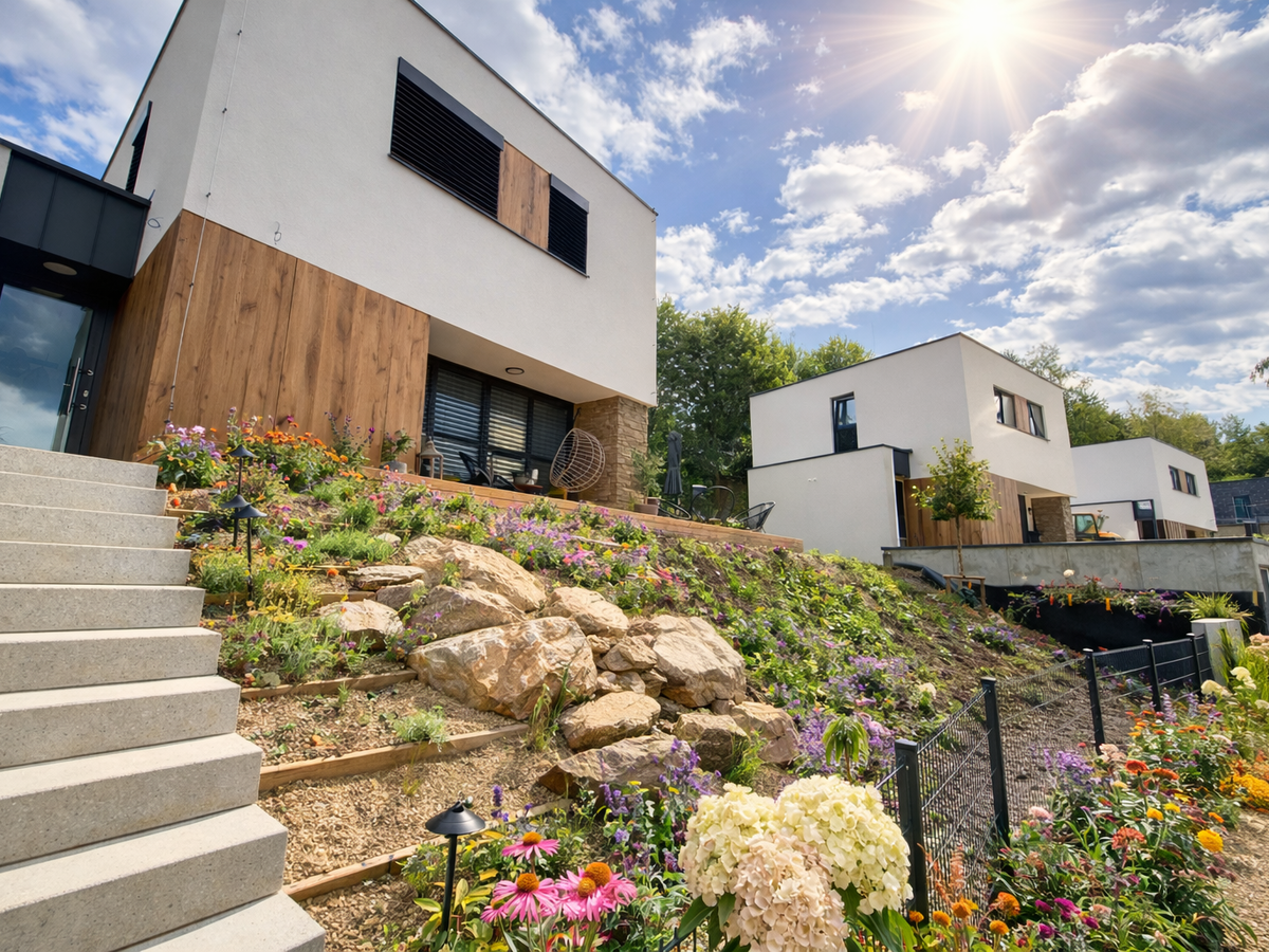 Exteriér domu vytváří harmonický dojem, který vás okouzlí svou pečlivě promyšlenou souhrou detailů. Předzahrádka, ozdobená okrasnou zelení, solitérními kameny a jemným osvětlením, skvěle doplňuje celkový vzhled. Trvalky a kvetoucí keře vnášejí do prostoru barvy a živost, čímž umocňují přívětivou atmosféru. Solitérní stromy dokonale zapadají do přírodního rázu zahrady jako symbol síly a stability. Betonová dlažba, pískované schody nebo betonový schod vytvářejí stabilní a estetický vstup do domu, který harmonicky ladí s okolním prostředím.