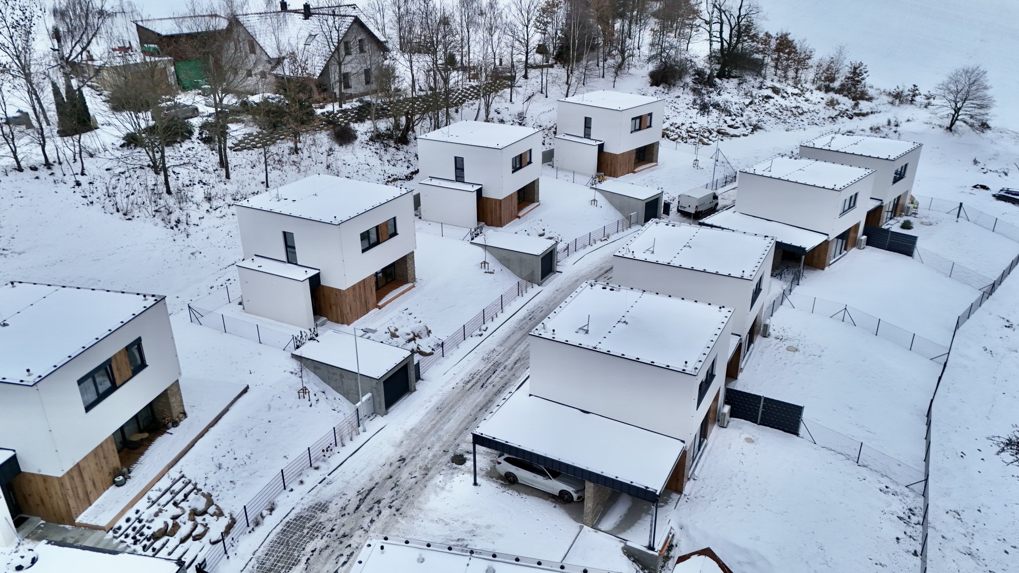 Parkování a garáž – Každý dům má dvě parkovací stání, jedno z nich je garážové nebo zastřešené s nabíjecí stanicí pro elektromobily. Garáž vybavena sekčními vraty a třífázovou zásuvkou, kterou najdeme tak i u zastřešených parkovacích stání.